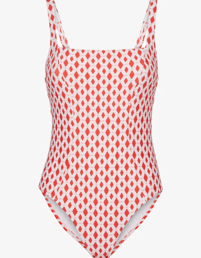 The Marrakesh Tie Back swimsuit from Heidi Klein is a pretty coral and white tile-inspired print in a one-piece style with adjustable straps and a back tie. As well as figure contouring front seams, the suit also has a shelf bra and soft boning in the side seams for hidden internal support.