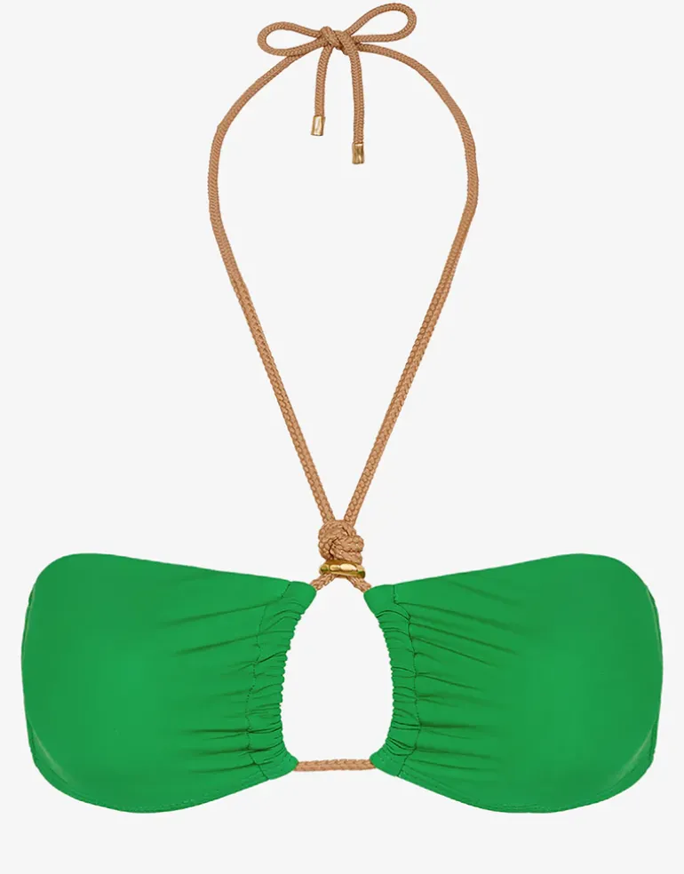 The Meadow Gal Isa Bandeau bikini top from ViX, in a vibrant Meadow green, is a stunning halter-style piece with a contrasting beige cord neck tie that loops through a keyhole detail between the cups, accentuated by a gold-plated embellishment. Featuring a magnetic back clip and removable padding for great shape.