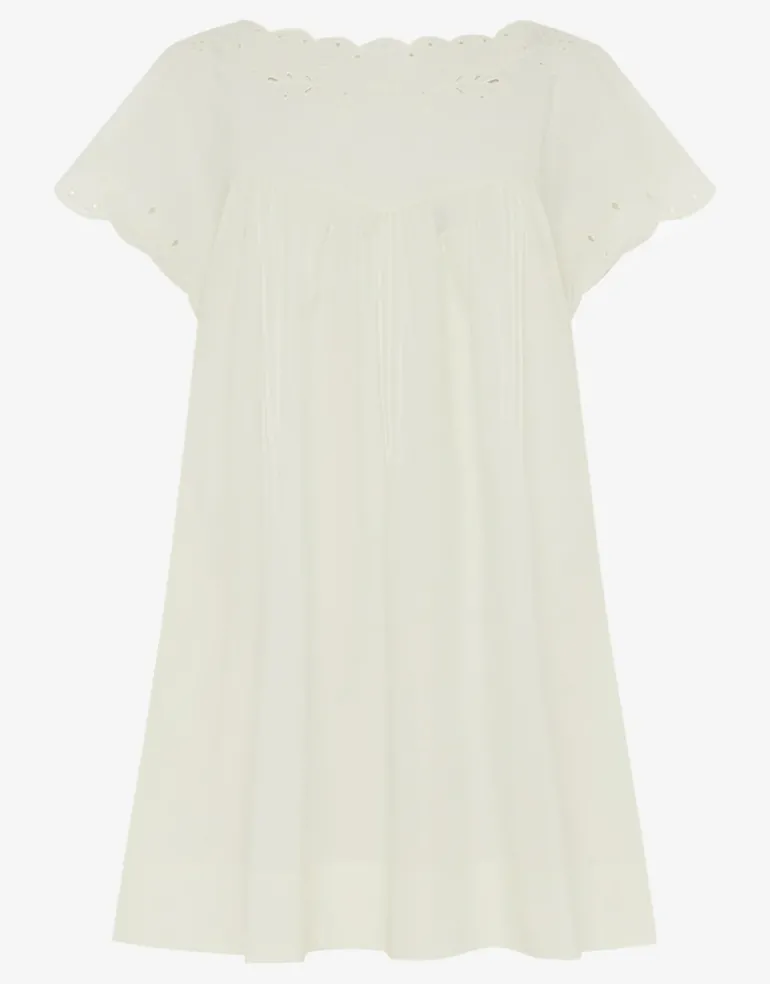 The Memoir Mini Dress from Peony is a cute little cotton dress with scallop edged neckline and sleeves, embroidered and cut out detailing and gathering across the front..