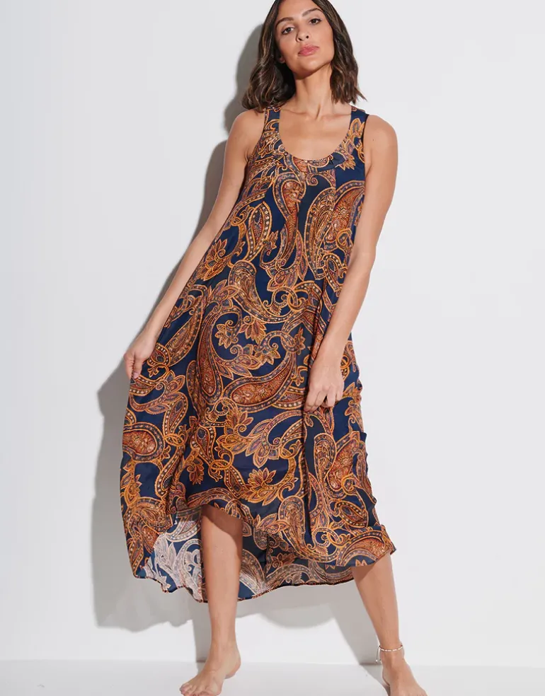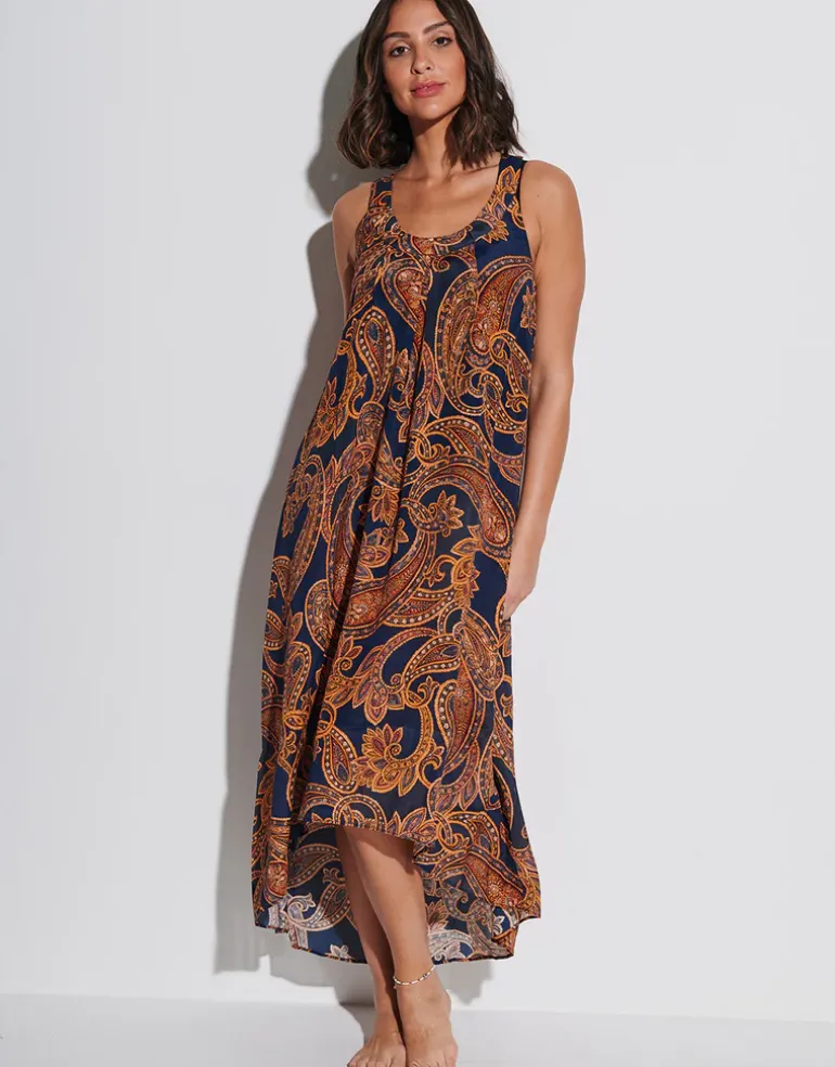The Memory Maxi Dress from Maryan Mehlhorn in soft silk viscose fabric is a beautiful navy and warm sunset print of paisley swirls and ethnic and oriental vibes. Sleeveless and maxi-length with a high-low hemline, a round neck and a pretty Pierrot style layered detail at the back.