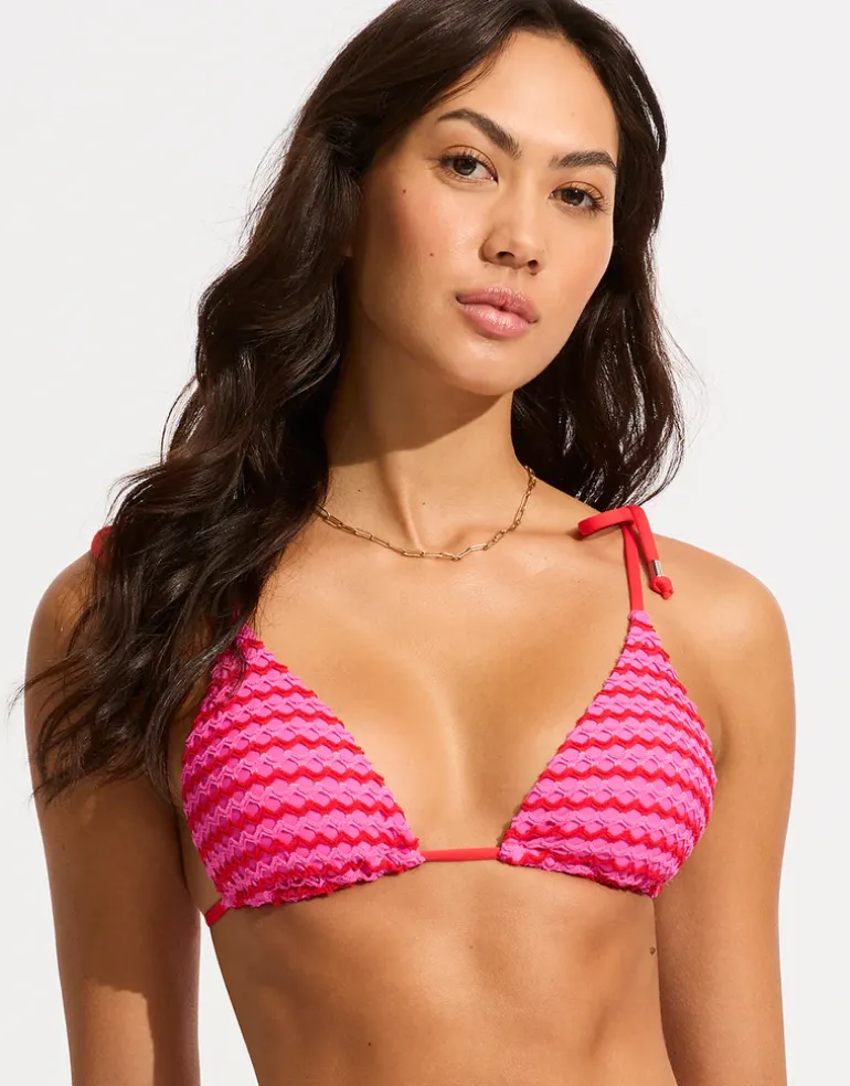 The Mesh Effect Slide Tri bikini top from Seafolly is a pretty triangle style made from ric rac knit textured fabric with removable cups and ties to the back and shoulders.