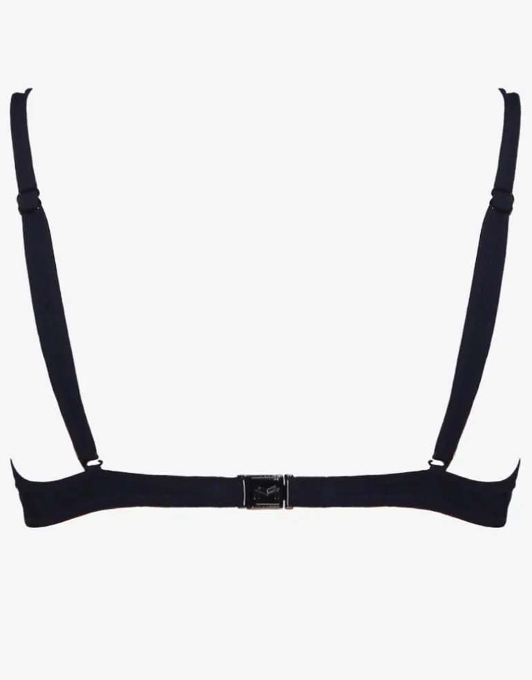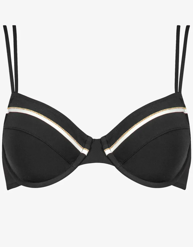 The Metrics Underwired bikini top from Maryan Mehlhorn is a super black bikini top with double straps at the front and a white and gold detail band on the cups. The cups are underwired and the straps are adjustable.