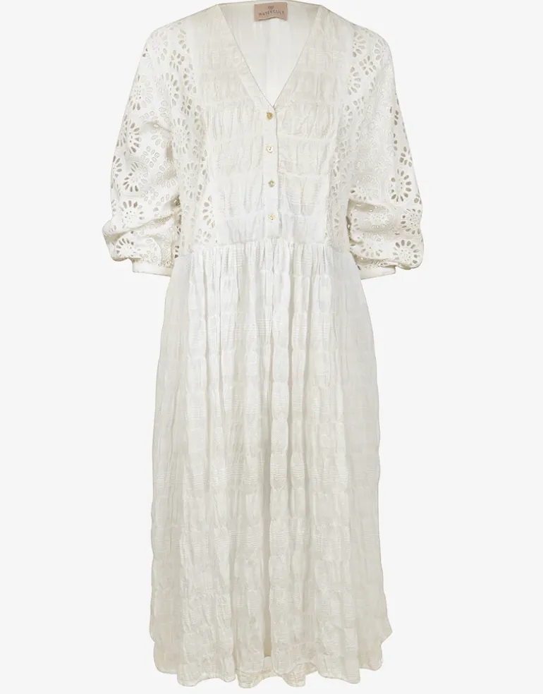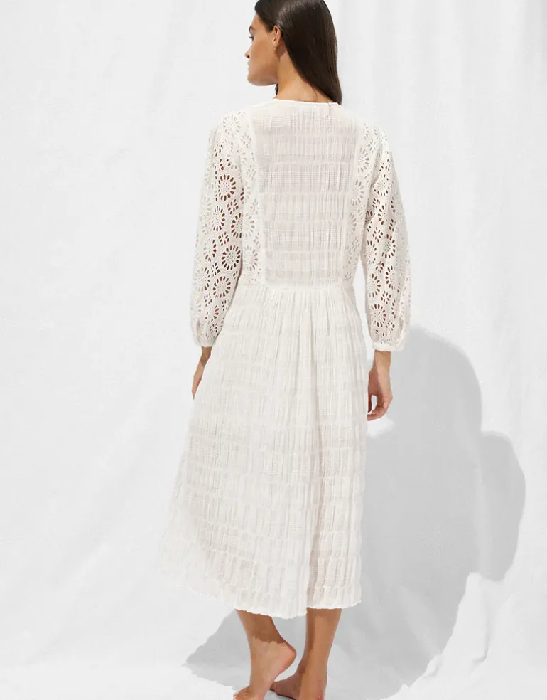 The Midi Beach dress from Watercult is an elegant dress, featuring a flattering V-neckline and button-down detailing to the waist. With long lace sleeves and a raised texture fabric on the body for added style.
