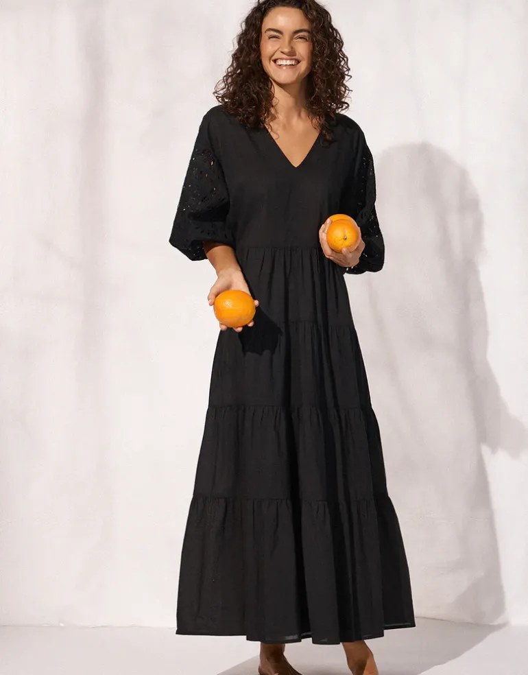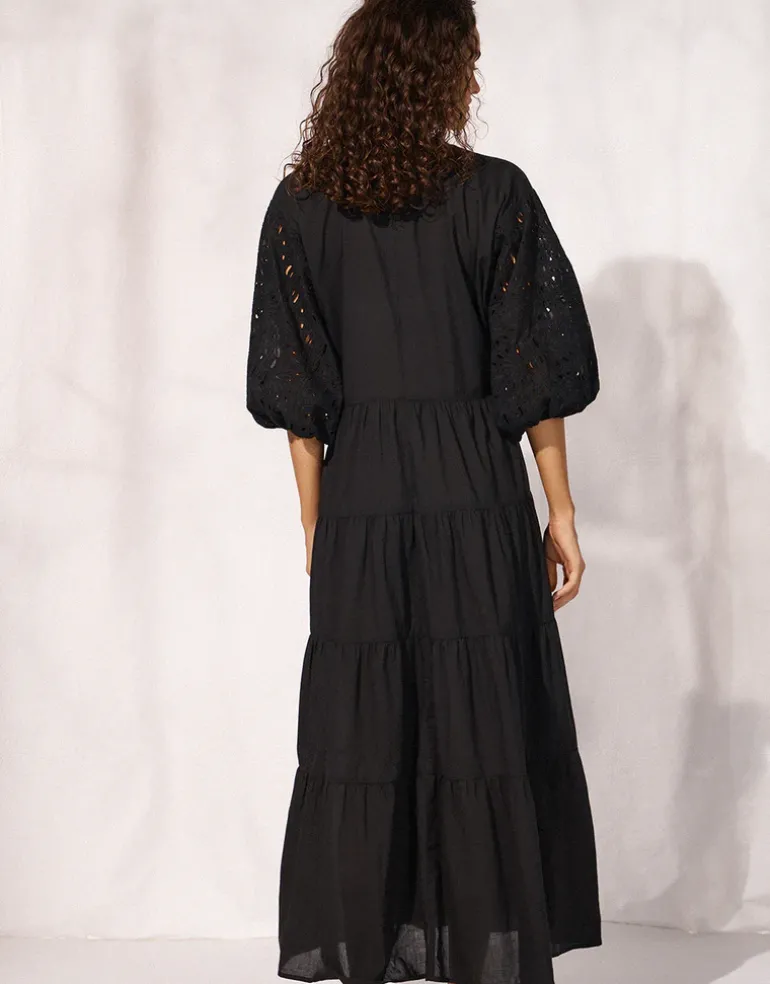 The Midi Dress from Watercult is a timeless black midi dress featuring short Broderie Anglaise sleeves and a flattering V-neckline. The dress boasts a smock-style skirt that falls gracefully in pleats, offering a relaxed yet elegant beach coverup.