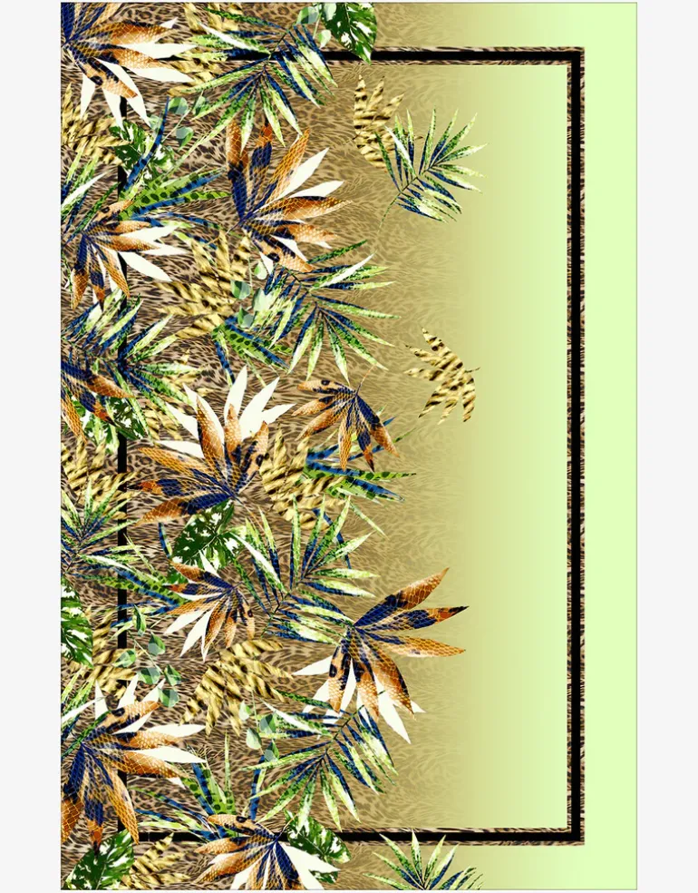 The Midnight Sounds Pareo from Charmline is a stunning jungle print pareo featuring fresh lime green, blues and neutral tones on a gold background with an animal print black border.
