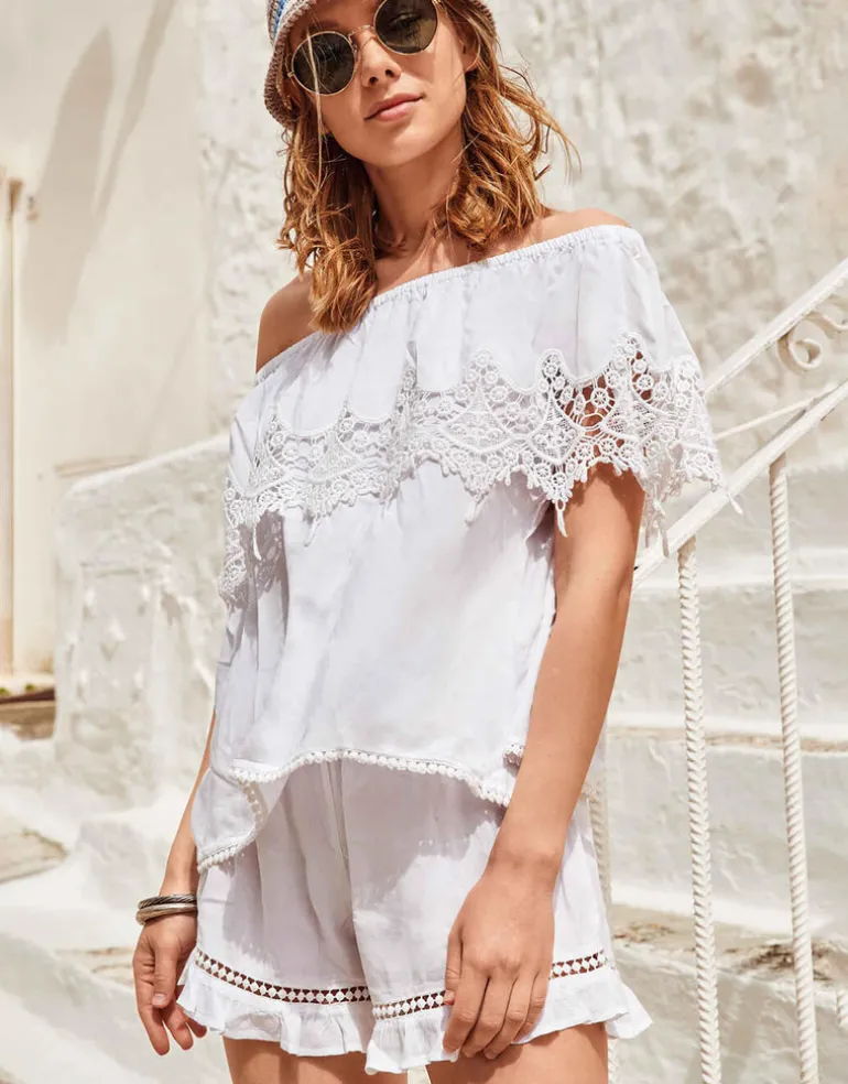 The Mila Shorts from Iconique are a lovely white cotton shorts with a smocked and elasticated waist, lace detailing and fluted leg hems.
