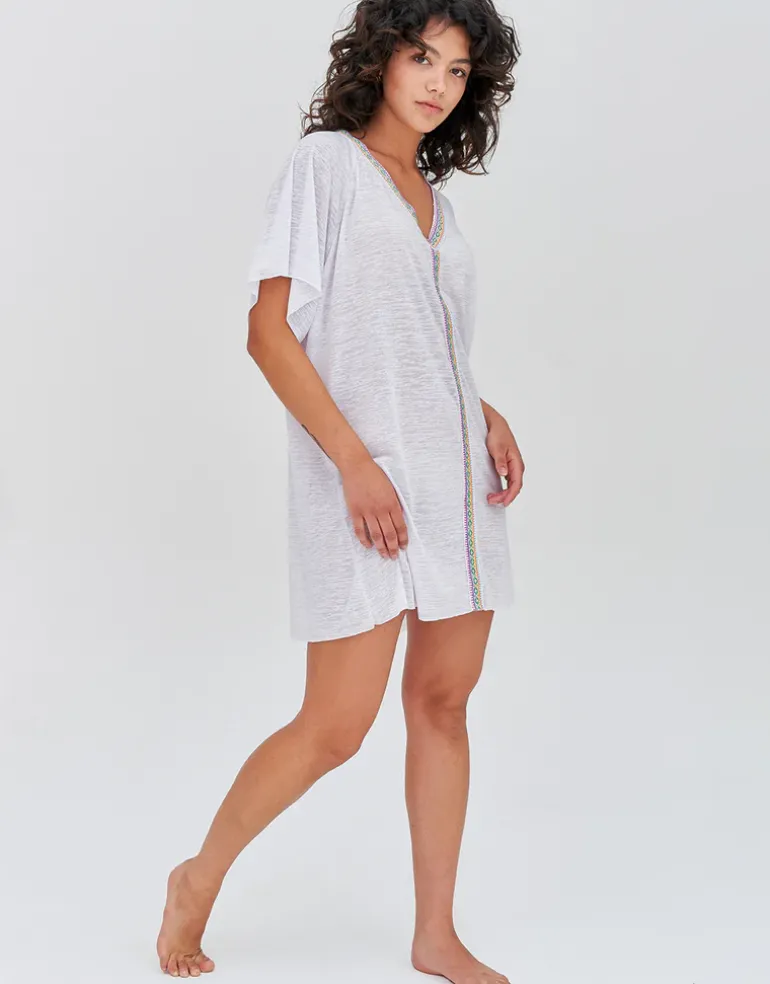 The Pitusa Mini Abaya Dress in white is a short kaftan dress with Pitusa Inca weave detailing at the V neckline and at the front. This style is available in Standard or Petite size. Choose Standard if you’re over 5ft 4in and Petite if you’re under (Petite is approx. 1″ narrower in width and 2″ shorter in length).