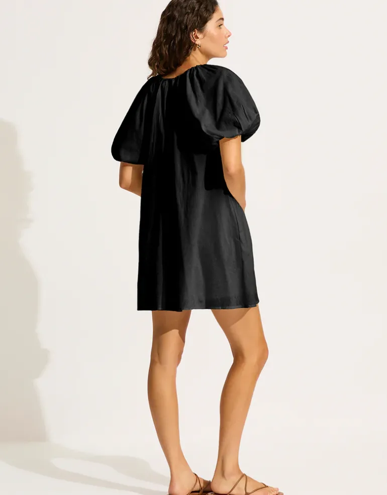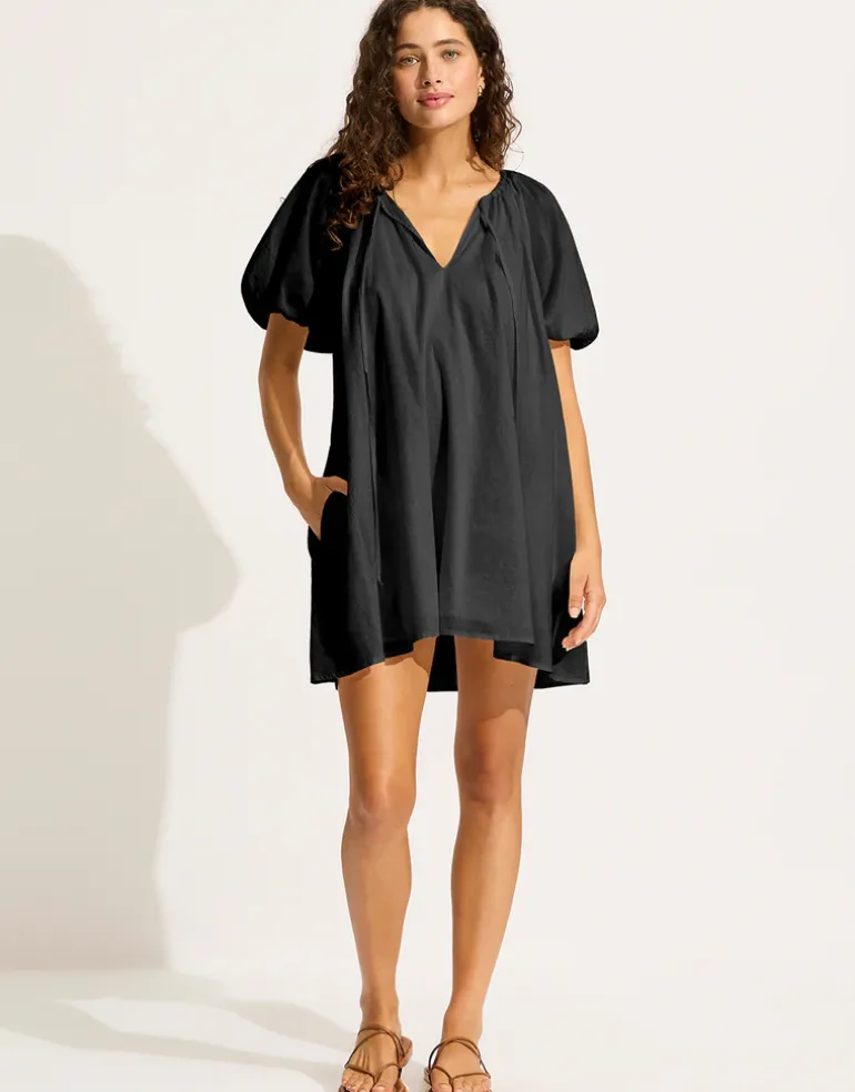The Mini Babydoll Beach dress from Seafolly in classic black is made from soft organic cotton. Fully lined, in mini-length, with short elasticated balloon sleeves, a V neck with tie and side pockets.