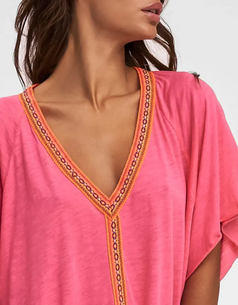 The Pitusa Mini Pima Abaya Dress in Hot Pink is a super soft short kaftan dress with Pitusa Inca weave detailing at the V neckline and down the front. This style is available in Standard or Petite size. Choose Standard if you’re over 5ft 4in and Petite if you’re under (Petite is approx. 1″ narrower in width and 2″ shorter in length).