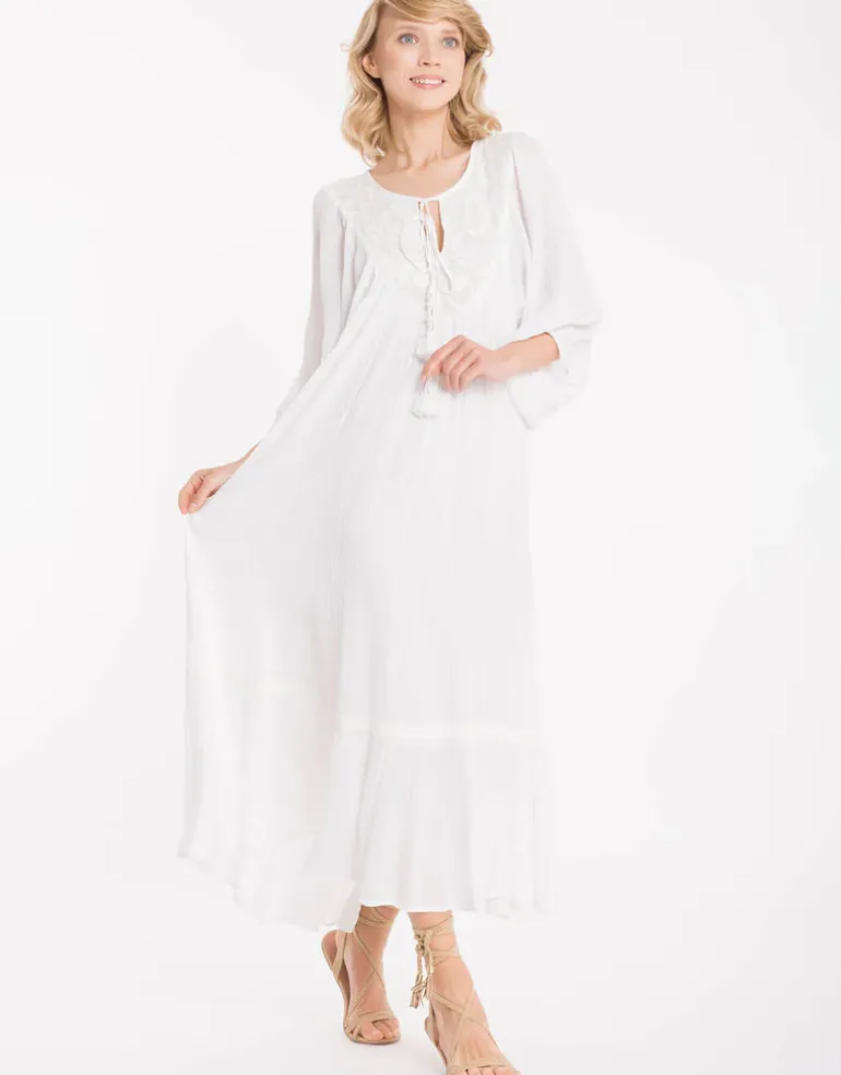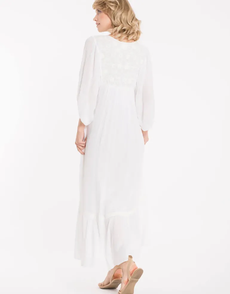 The Monica Maxi Dress from Iconique has a drawstring neckline, lacey yoke and three quarter sleeves.