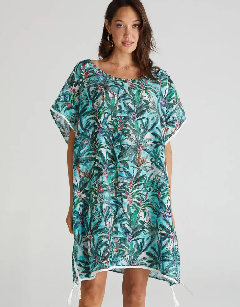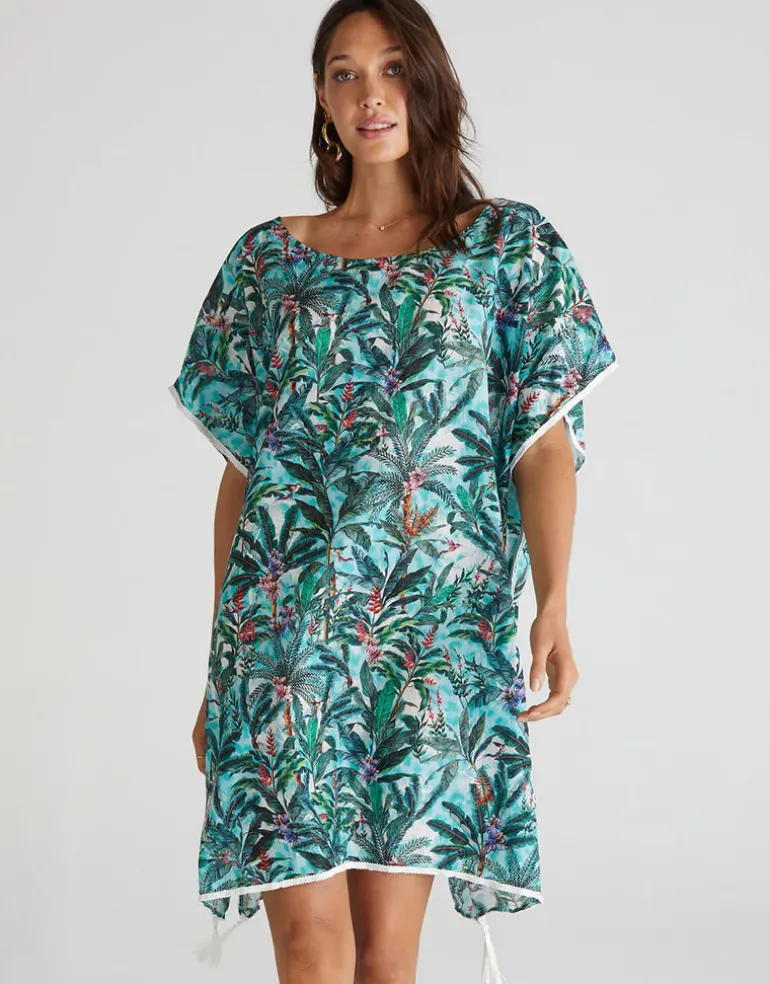 The Muse print Kaftan by Aqua Blu Australia is crafted from luxurious cotton-silk blend. Elevate your poolside style and pair with a statement earring and flats.