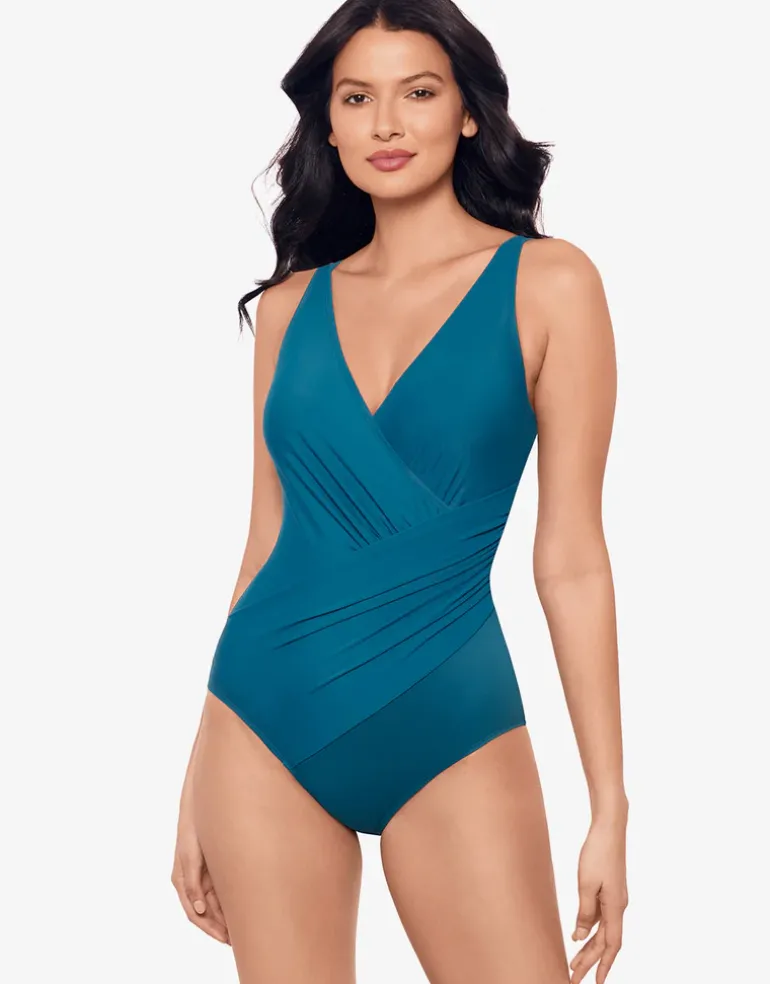 The Oceanus Swimsuit from Miraclesuit is a wonderfully flattering ladies wrap front swimsuit with soft cups, crossover panels and ruching on the tummy for greater waist-minimizing effect. The Must Haves version in Aegean colour is great option of this classic Miraclesuit style.