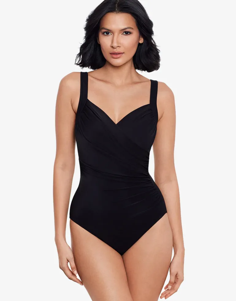 The popular Sanibel swimsuit from Miraclesuit is a classic underwired style with draped front and comfortable wide adjustable straps. This elegant looking Must Haves version in black is a popular option for the pool or the beach.