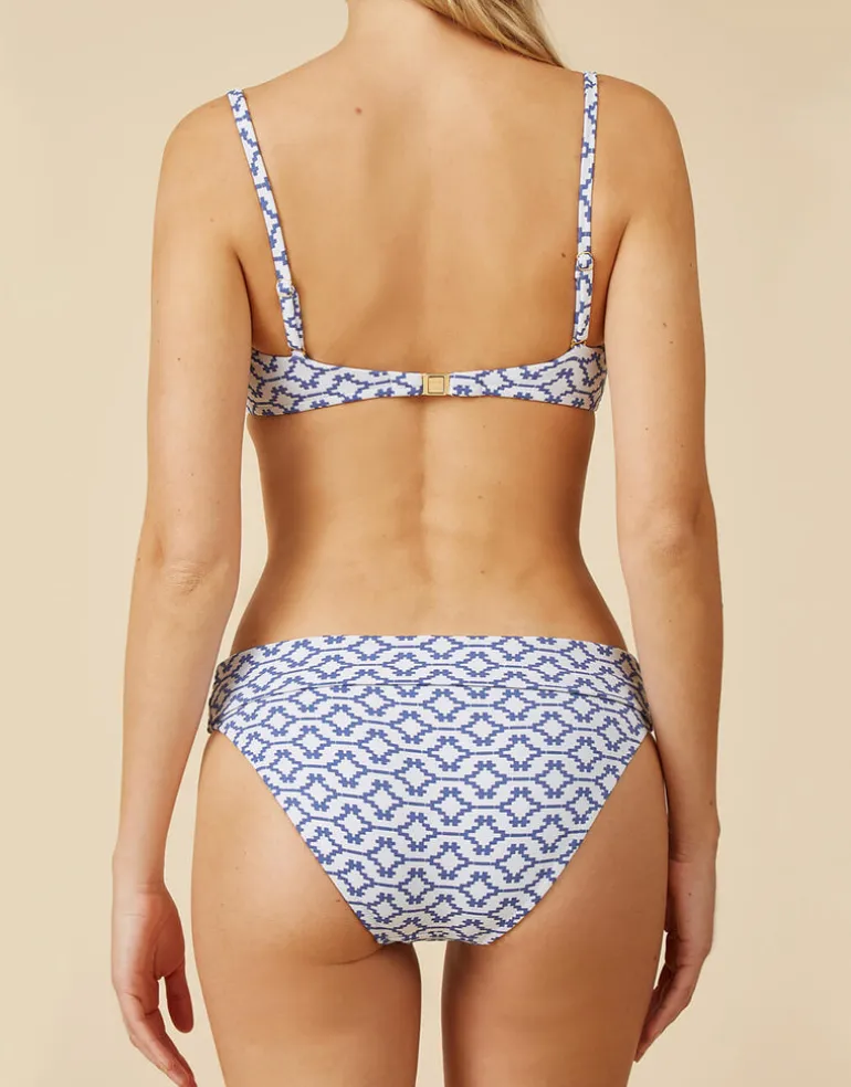 The Mykonos Fold Over bikini pant from Heidi Klein is made from a pretty blue and white textured print fabric. With good rear coverage and a wide fold at the waist, fixed at the sides.