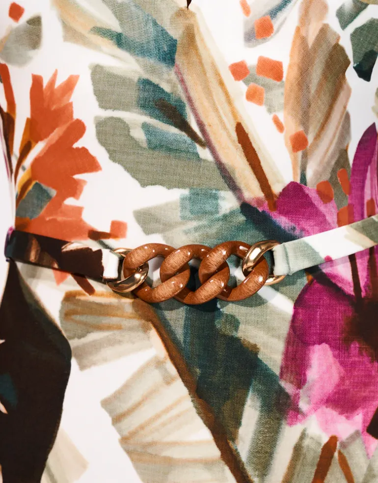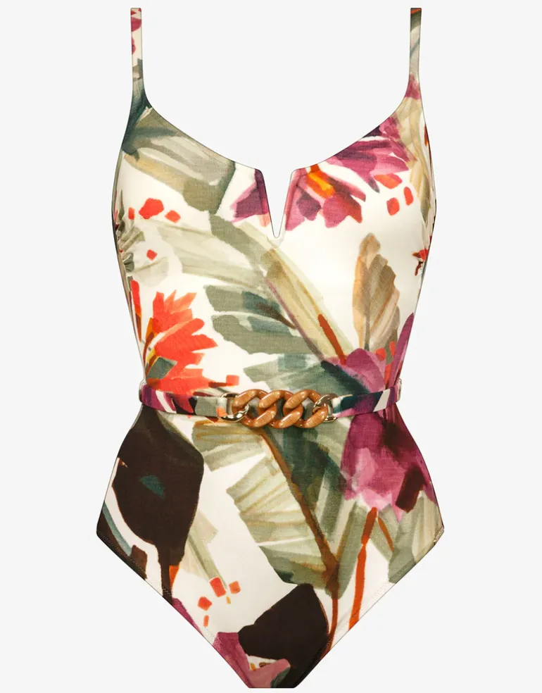 The Mystic Belted swimsuit from Maryan Mehlhorn is a beautiful green and dusky pink oversized tropical floral print on a cream base with orange and khaki highlights. With moulded cups and a V-shaped slash at the front, adjustable straps and a wood-look chain detail belt at the front.