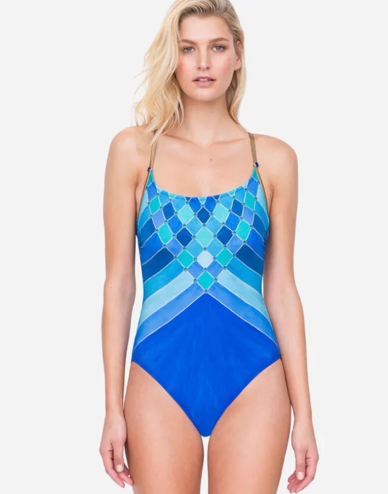 Lounge luxuriously in this Gottex Mystic Gem Round Neck Swimsuit in a tonal blue design with gold shoulder straps, finished with blue gem embellishment on the crisscross back detail.