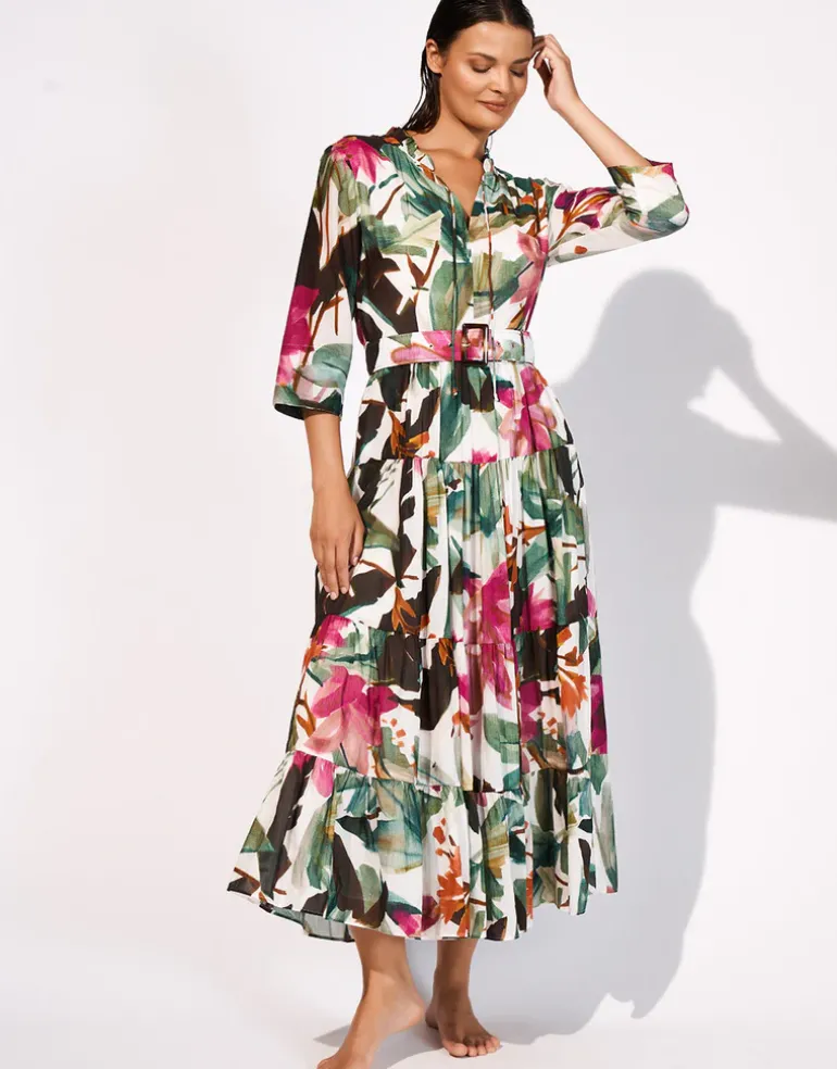 The beautiful Mystic print from Maryan Mehlhorn is a muted green and pink oversized tropical floral print on a cream base with orange and khaki highlights and subtle metallic top-stitching. This beautiful statement maxi shirt dress features a full gathered tiered skirt, cinched at the waist with a wide belt, a ruffled V neckline with ties and three-quarter length sleeves.