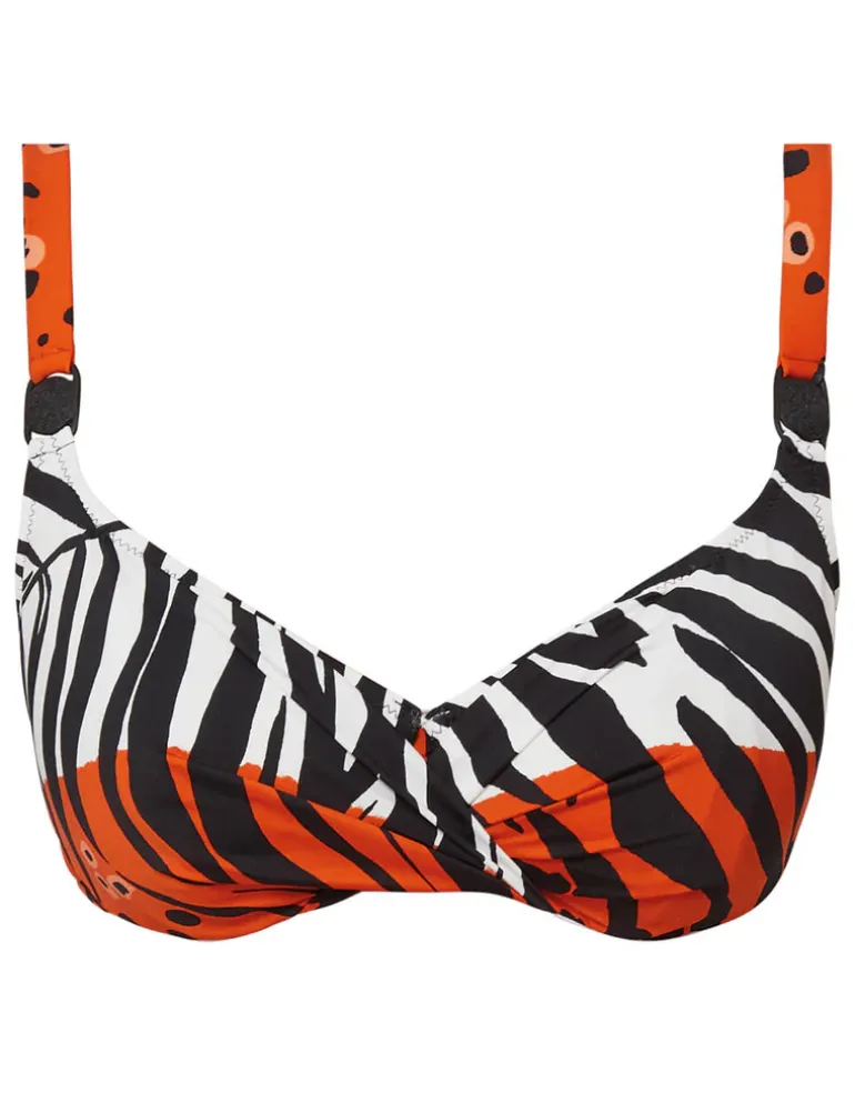The Nairobi Underwired bikini top from Nuria Ferrer is a striking burnt orange, black and white animal print style featuring animal spots and zebra style leaf print. This top features underwire, a clip back and adjustable straps.