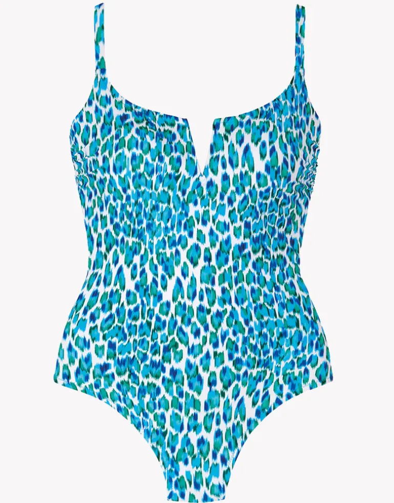 The Nassau Moulded swimsuit from Tessy by Roidal in lovely turquoise blue and green animal print has a notch neckline creating a subtle plunge style. With moulded foam cups and adjustable straps for great shape and fit.
