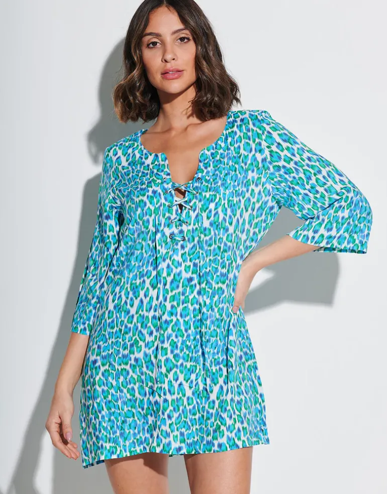 The Nassau Tunic from Tessy by Roidal is a beautiful turquoise blue and green animal print mini-length beach dress with a lace-up keyhole neckline and three-quarter length sleeves.