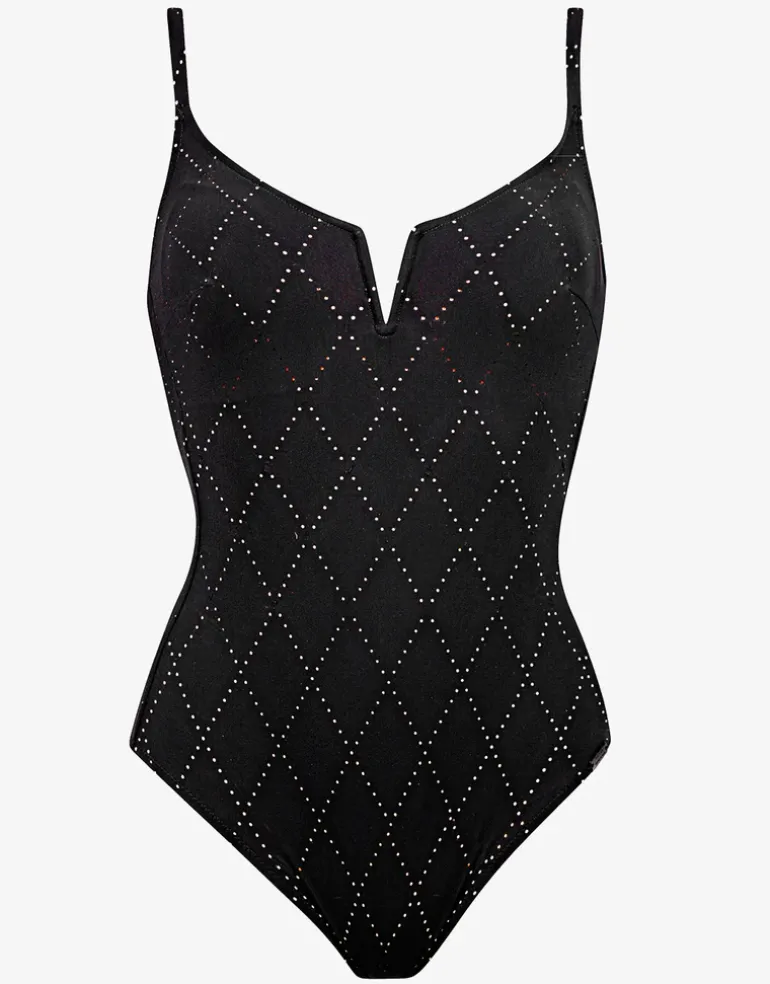 The Noircraft Moulded Swimsuit from Maryan Mehlhorn features a sophisticated minimalist rhomb pattern, laser-cut into premium fabric for a timeless, understated look of luxury. Designed with a subtle plunge v-neckline, moulded cups, and adjustable straps for a perfect fit.