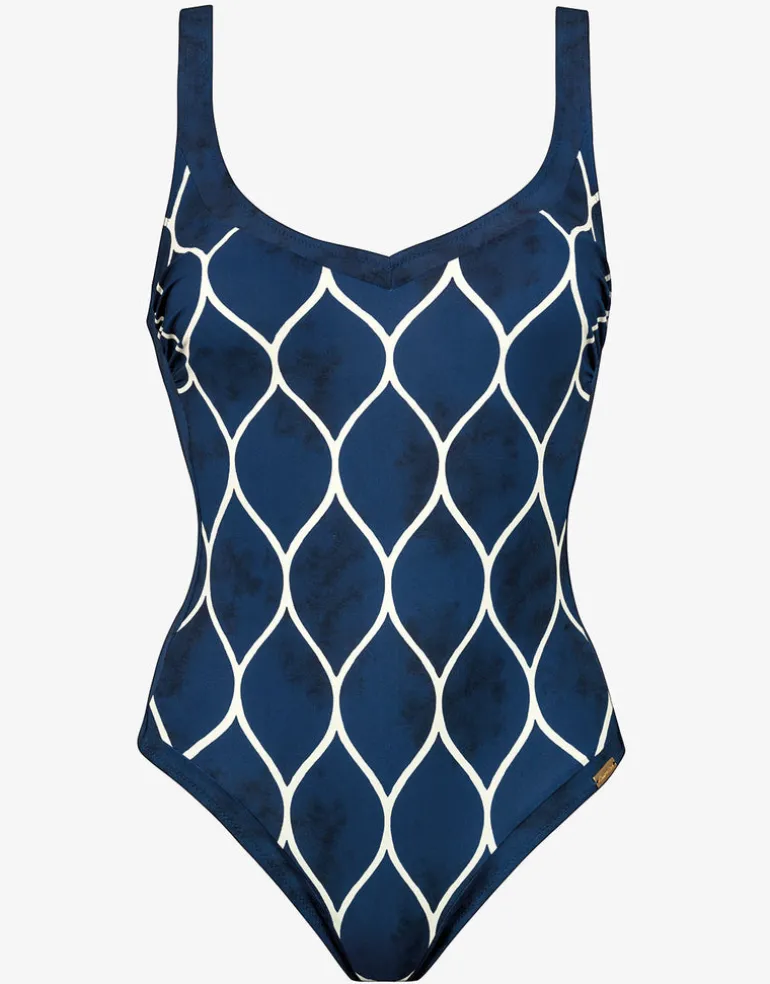 The Ocean Cloud Moulded swimsuit from Charmline features a stylish graphic wave design in denim blue and cream. With moulded cups, light shaping, and a navy-bordered shaped neckline, this swimsuit combines comfort and elegance for a flattering beachside look.
