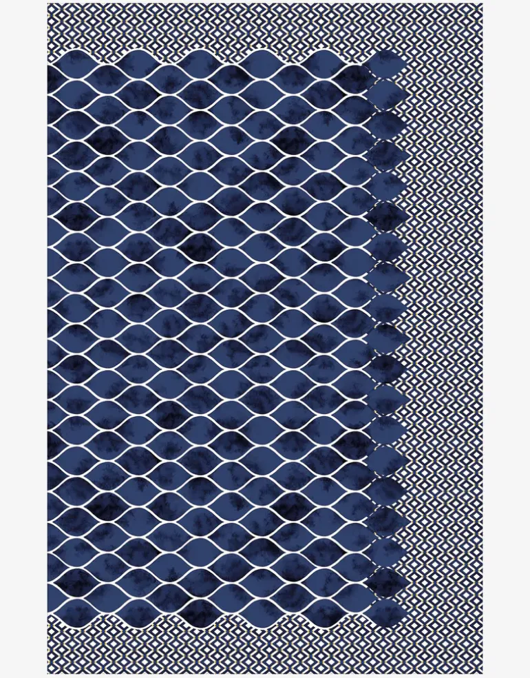 The Ocean Cloud pareo from Charmline features an elegant denim blue and cream wave print, beautifully framed by a three-sided border showcasing a delicate smaller wave pattern.