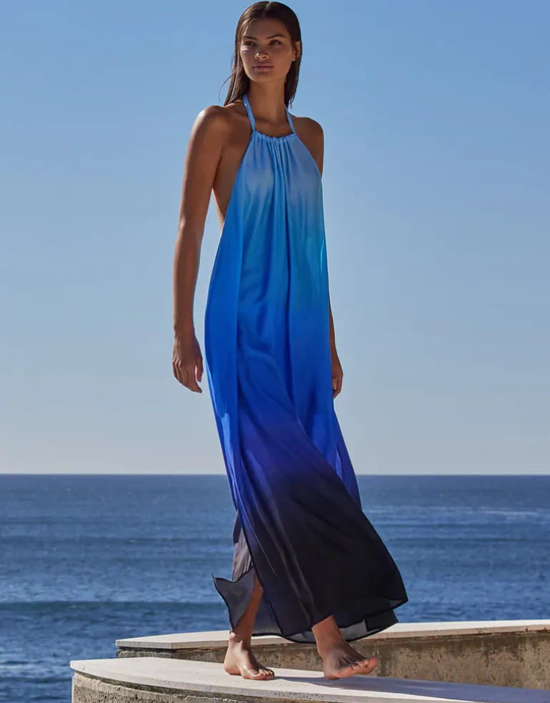 The Oia Sunset Halter Maxi dress from Jets is a fabulous maxi length, halter neck dress in this gorgeous blue ombre design with gathers and a tie at the neck and side pockets.