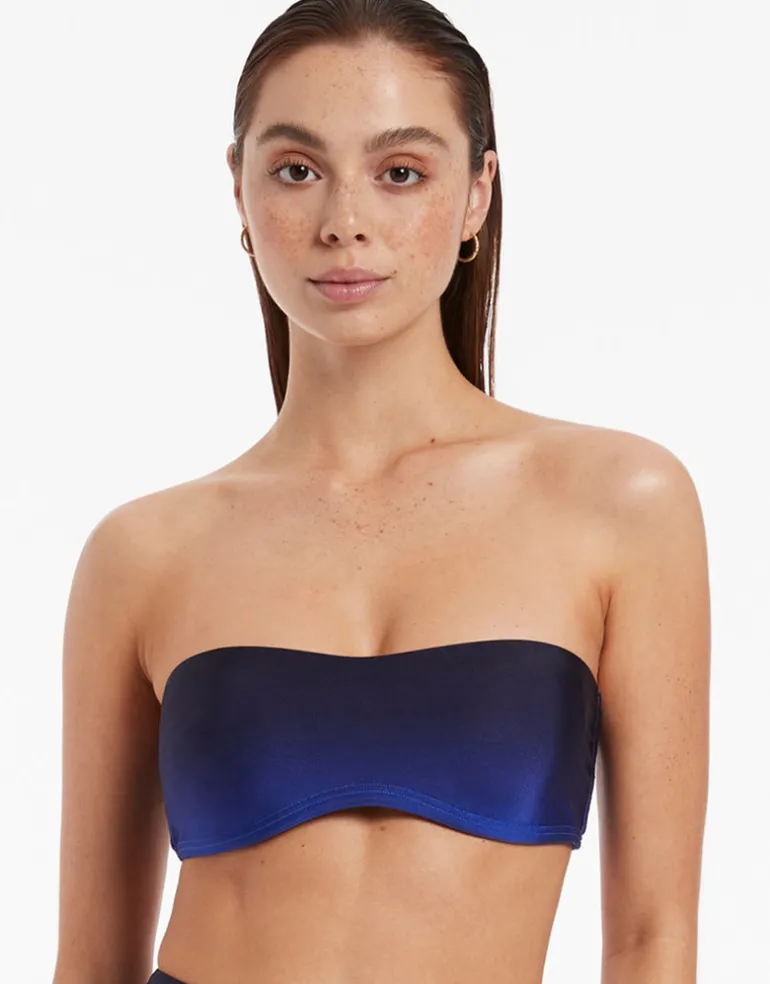 The Oia Sunset Minimal Bandeau bikini top from Jets is a sleek, strapless style with comfortable wide sides and an oversized clip at the back for optimum support. Inside there are removable cups, side boning and gripper tape for shape and support.