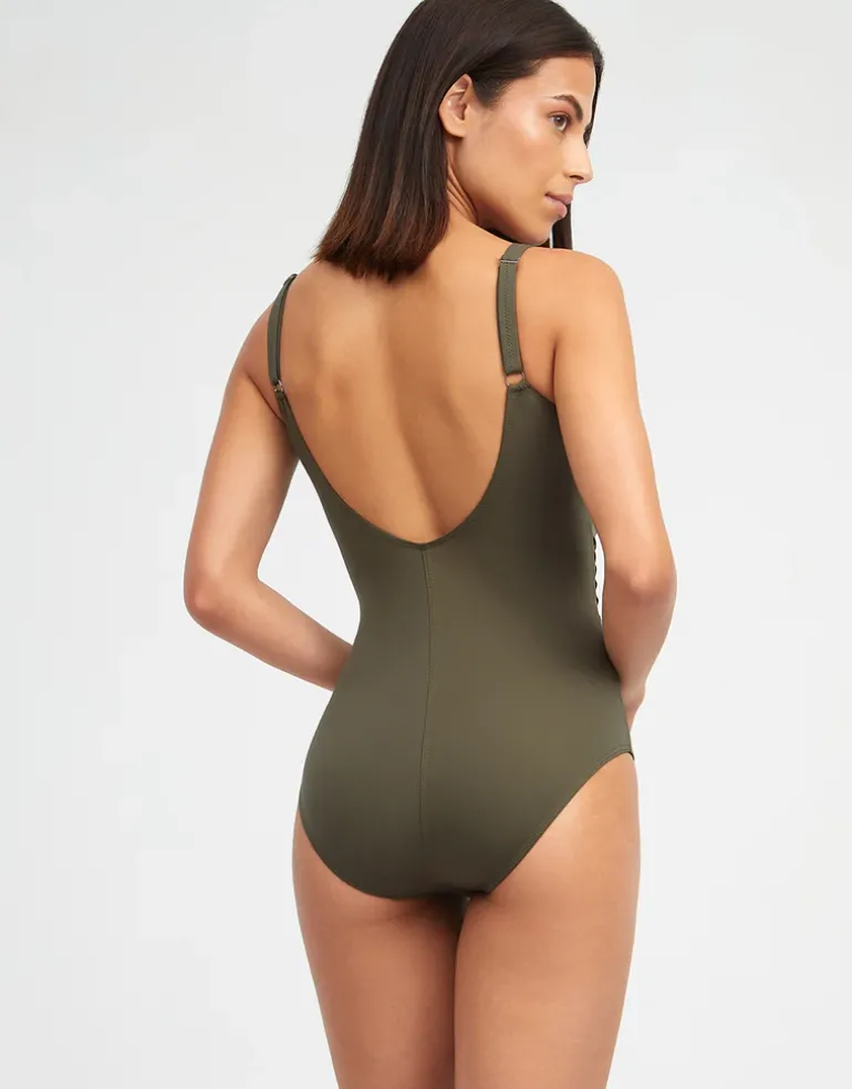 The Olivia Freedom Tank swimsuit from Nuria Ferrer in understated khaki green is a classic tank style swimsuit with adjustable straps and flattering pin tuck detailing around the waist.