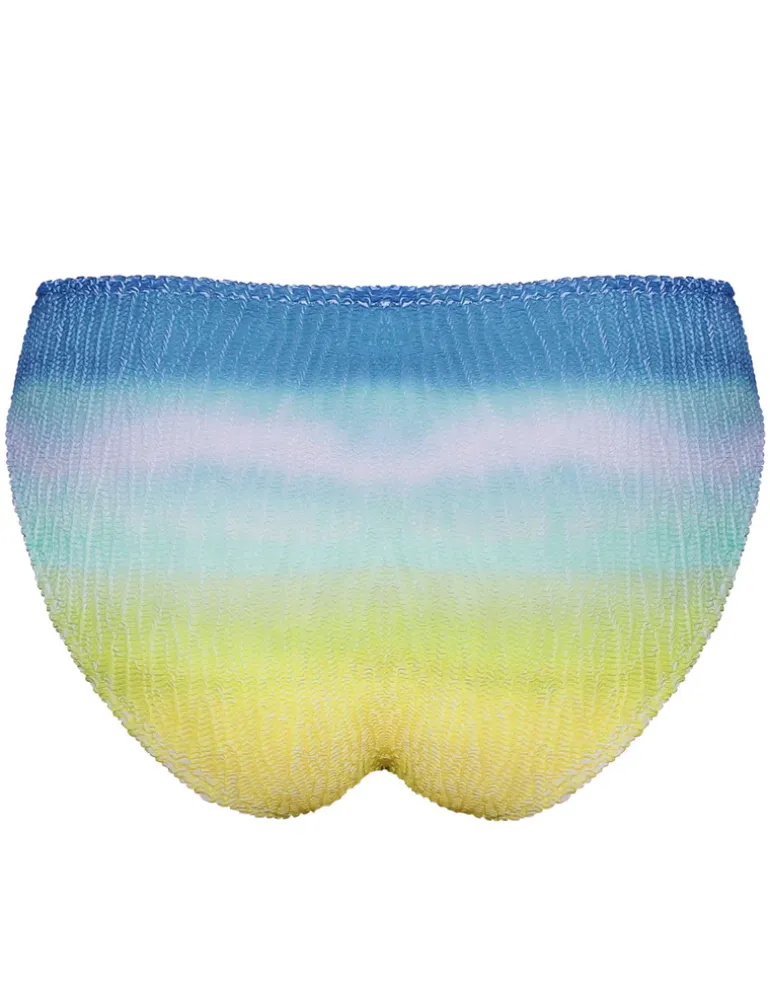 The Ombre Flow High Leg bikini pant from Watercult is a lovely knitted stretch fabric, high-leg bikini pant style in blue, white and yellow ombre print with moderate coverage.