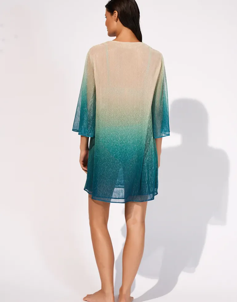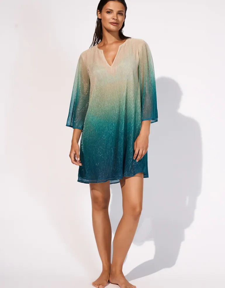 The Ombre Metallic tunic from Maryan Mehlhorn with its shimmering gold tones and metallic fleck features a stunning ombre effect that transitions from light gold at the neckline to a deep teal blue at the hemline. This mini-length tunic has a flattering V-neckline and graceful, fluted mid-length sleeves.