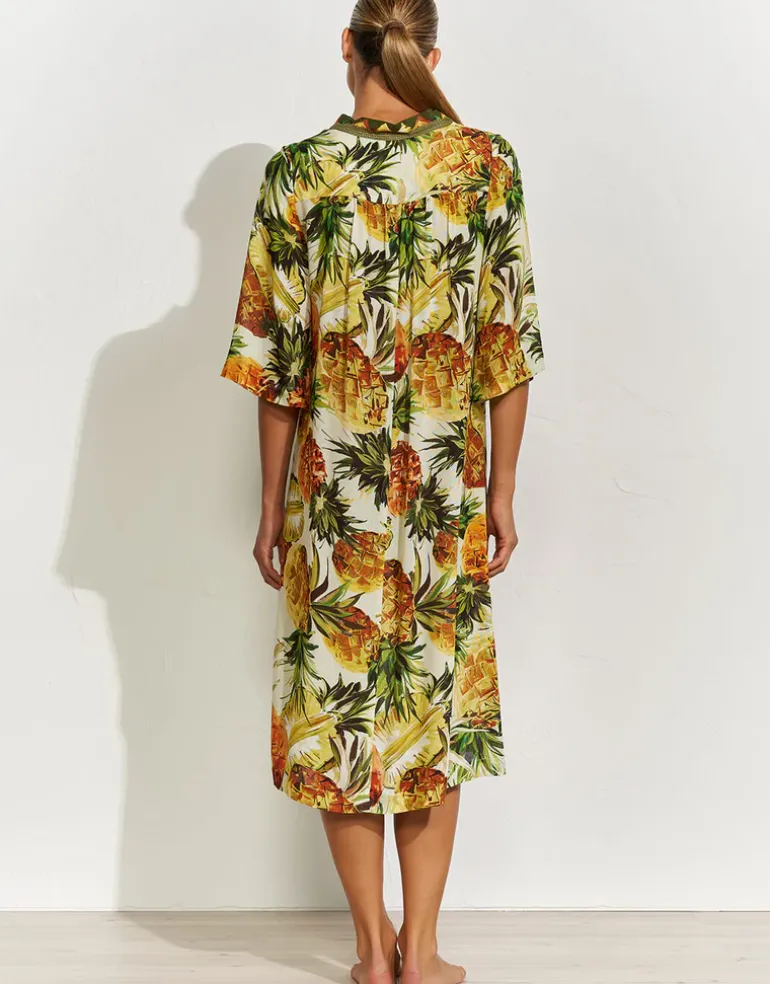 The Optimist Kaftan from Maryan Mehlhorn is a fantastic tropical pineapple print, midi length kaftan with a contrasting neckline. With elbow-length sleeves and short side slits, this beautiful kaftan is a great addition to the Optimist swimwear styles.
