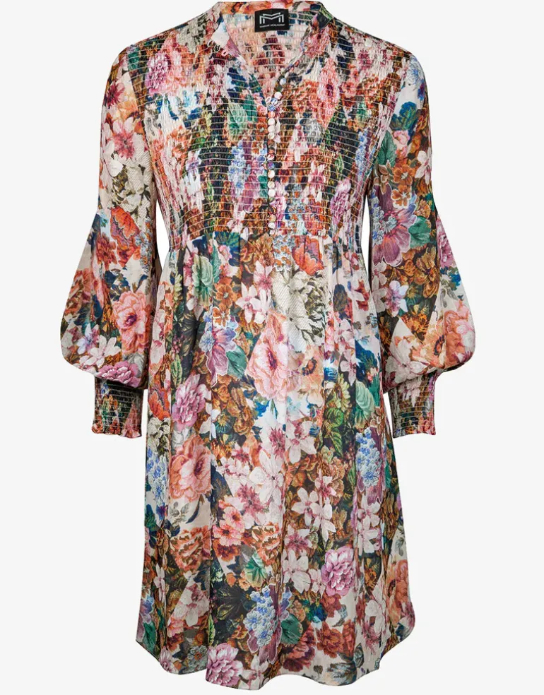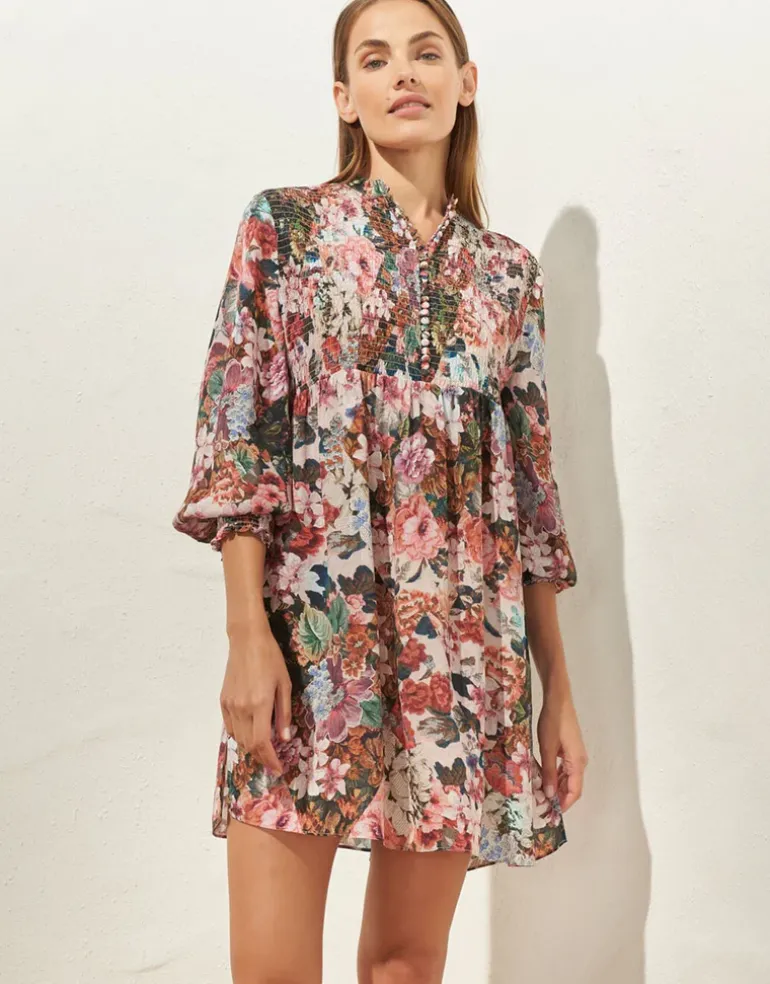 The Opulence Tunic from Maryan Mehlhorn is a beautiful blouse style tunic in antique furnishing style floral interwoven with geometric pattern. Mini length and with long balloon sleeves gathered at the cuffs with pintuck detailing. The front is buttoned to the waist and features matching pintucks across the front.