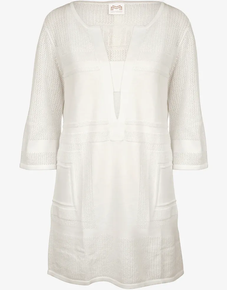 The Organic Cotton Tunic from Maryan Mehlhorn is a fabulous organic cotton and lurex knitted kaftan with panelled design, a V-neck with tab at the bust and three-quarter length sleeves.