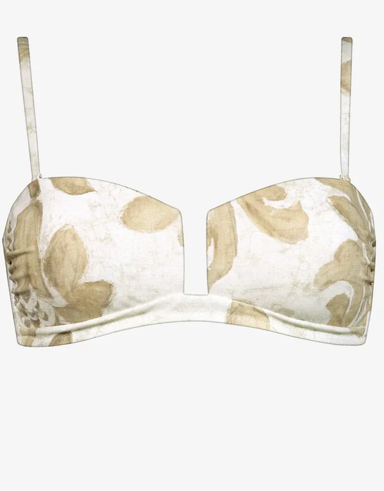 The Ornation Bandeau bikini top from Maryan Mehlhorn in this summery canvas white and sand tropical foliage print, is a strapless style with a deep cut-out at the front, moulded foam cups and narrow removable straps.