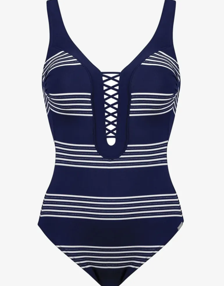 The Pace Plunge swimsuit from Maryan Mehlhorn is a striped navy and white design, with thin metallic silver thread stripes between the white lines to elevate and highlight. Crisscross lacing at the front gathers the plunge.