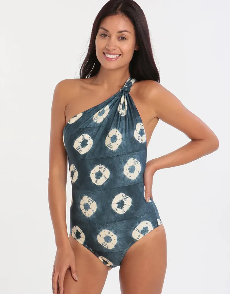 The Lenny Niemeyer Padang One Shoulder Knot Maillot is inspired by traditional Indonesian textiles and is cut with a gathered one shoulder strap for an elegant poolside look.