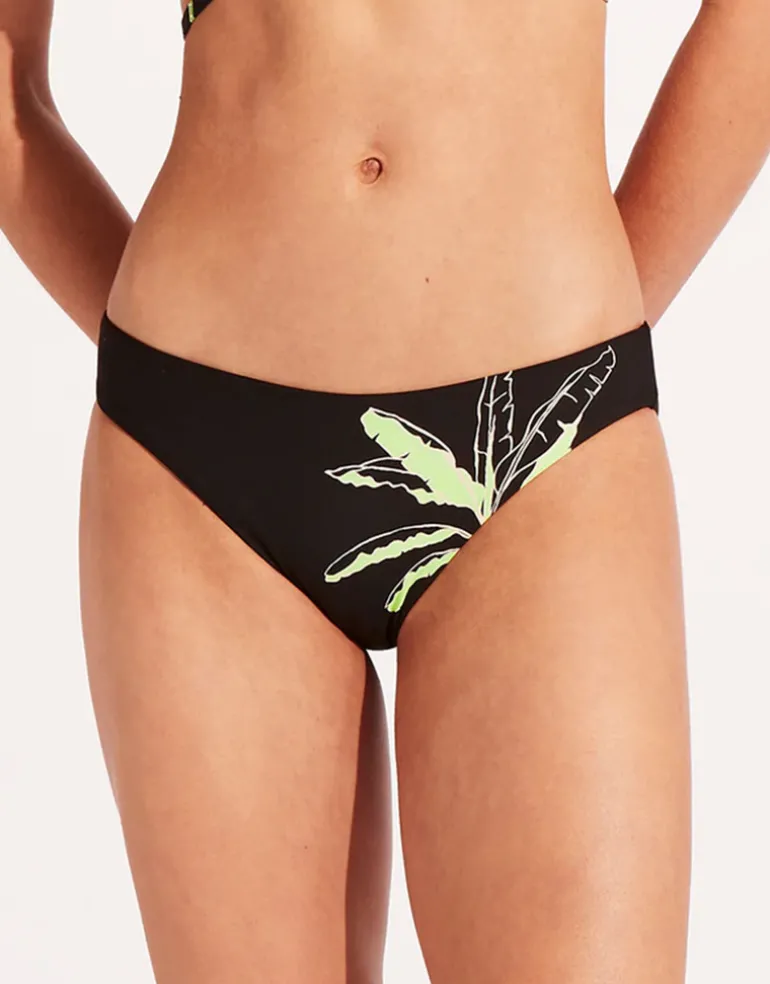 The Palm Paradise Hipster bikini pant is a classic hipster style with moderate coverage in this gorgeous green and black banana leaf print.