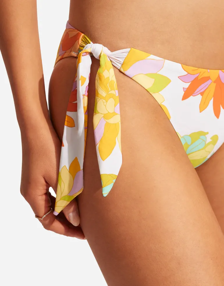 The Palm Springs Tie Side bikini pant from Seafolly is a fresh and colourful 70s style floral print on white base with a moderate coverage fit and wide tab ties to the sides.