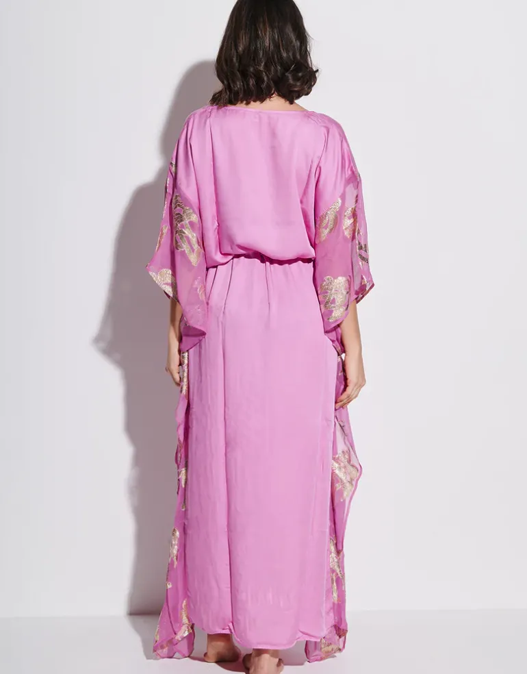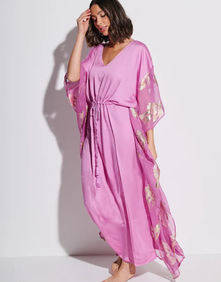 The Palm Tree kaftan in pink from Pitusa is a lovely maxi-length style with a V neck, loose sleeves and a gathered drawstring waist with rope effect tie. The body of the kaftan is made from modal satin and the sleeves are sheer viscose decorated with gold lurex palm tree detailing.