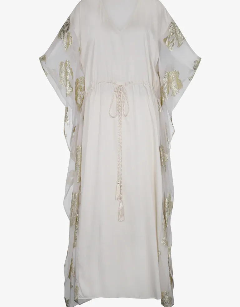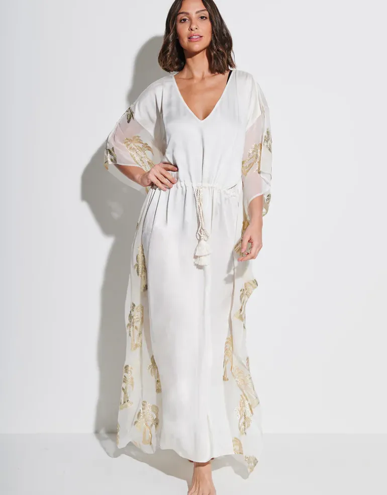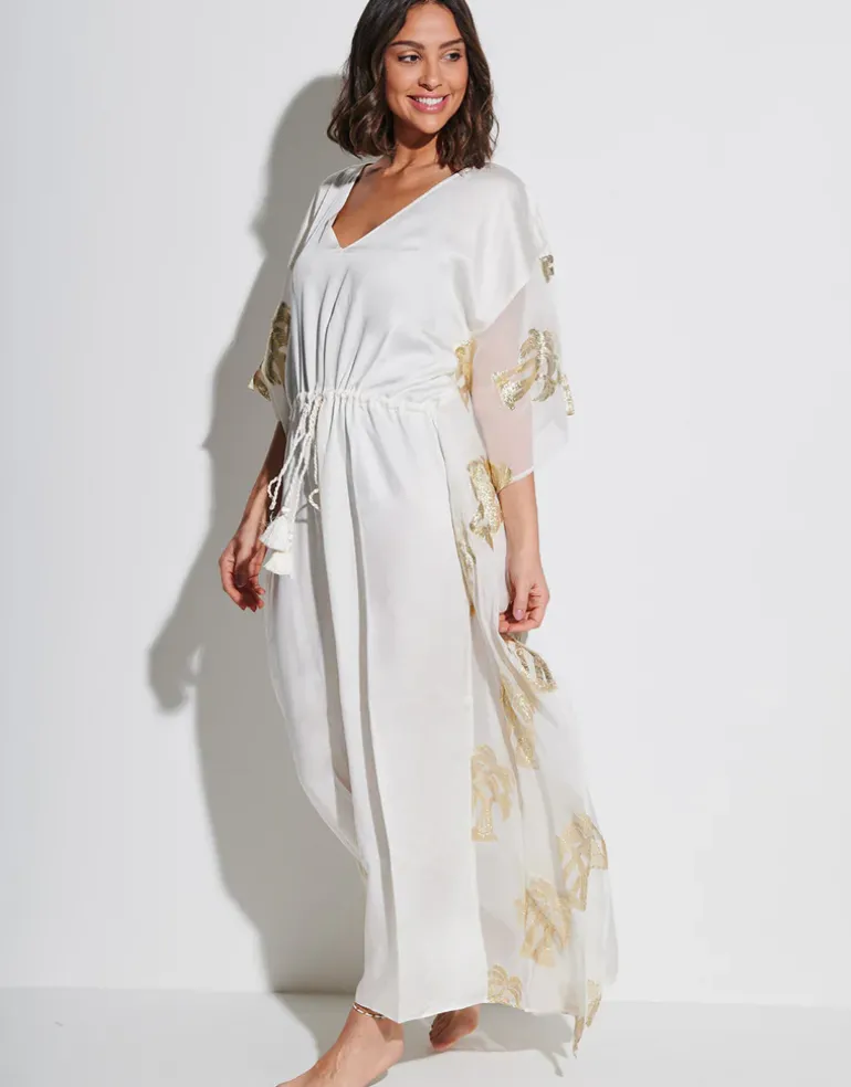 The Palm Tree kaftan in white from Pitusa is a lovely maxi-length style with a V neck, loose sleeves and a gathered drawstring waist with rope effect tie. The body of the kaftan is made from modal satin and the sleeves are sheer viscose decorated with gold lurex palm tree detailing.