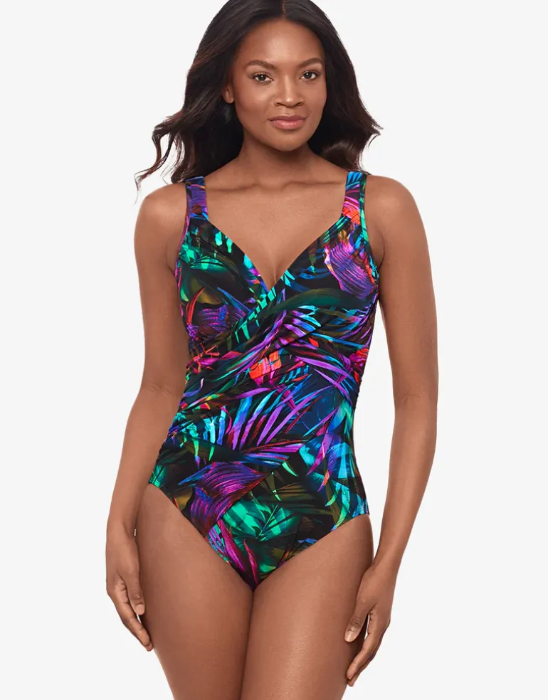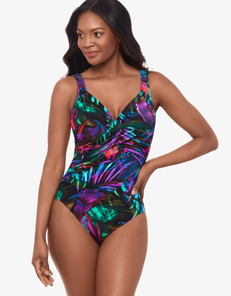 The Palma Paradiso Revele swimsuit from Miraclesuit in this bold mix of green and purple tropical print is a v neck style with plenty of ruching across the tummy for a slimming silhouette. The styling features moulded underwired foam cups and comfortable wide straps.