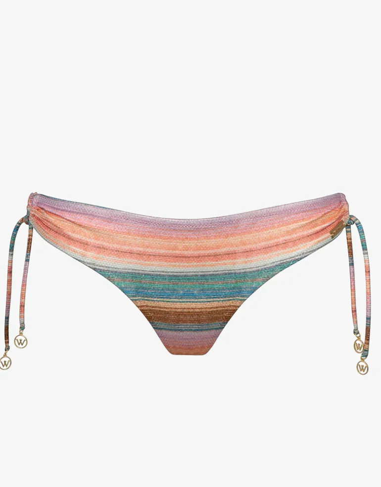 The Pastel Sunset bikini pant from Watercult is a pretty pink and turquoise stripe style with moderate coverage and ties at the side finished with tiny metallic W motifs.