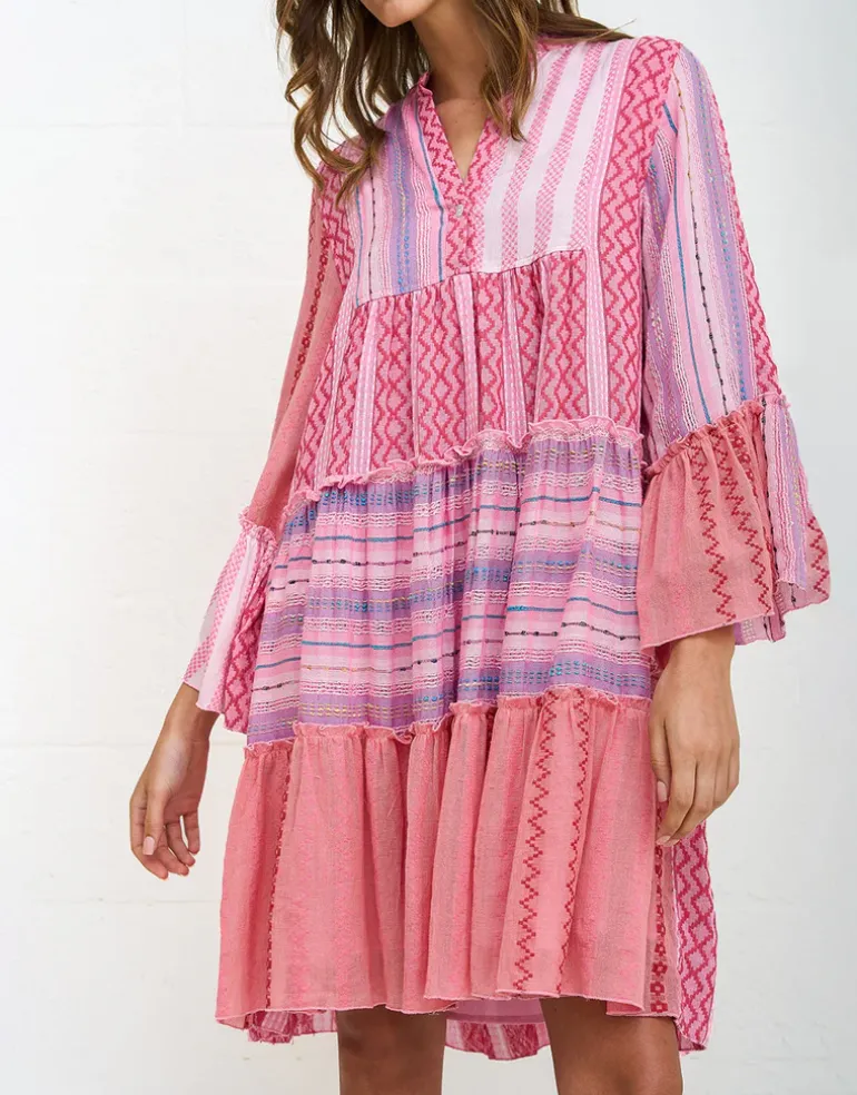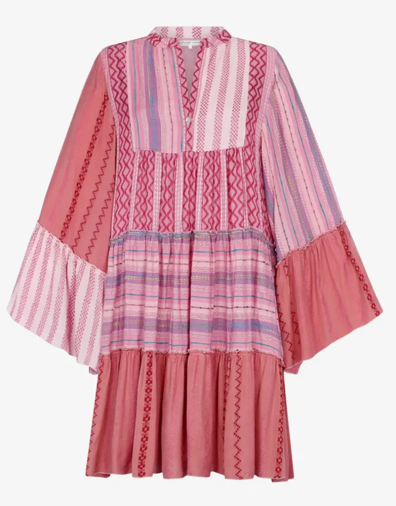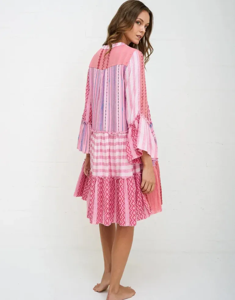 The Patchwork Mini Boho Dress from Pitusa is a cute smock-style tiered dress with a V-neckline and single button closure. Constructed in a lovely pink patchwork print, it boasts fluted long sleeves and a relaxed, floaty silhouette for bohemian chic.