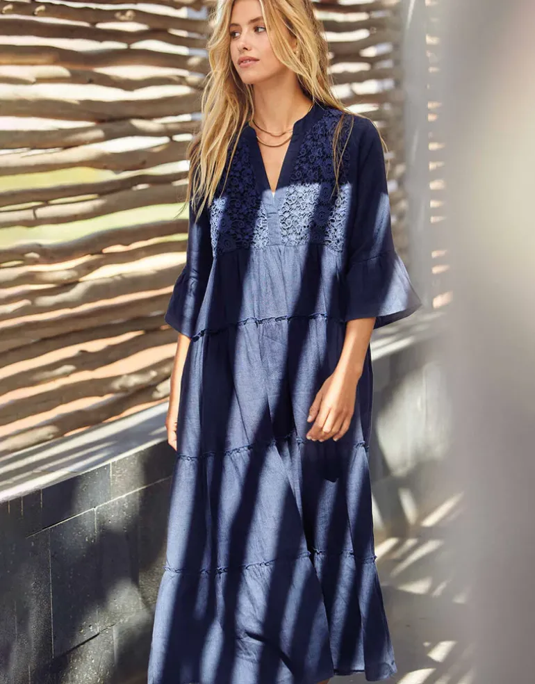Crafted from a natural cotton and linen blend, the Penny Maxi dress in navy blue from Iconique is a must have for the summer. With three quarter bell sleeves and multi-tiered skirt, this iconic dress features a v neckline and lace inserts along the bust.