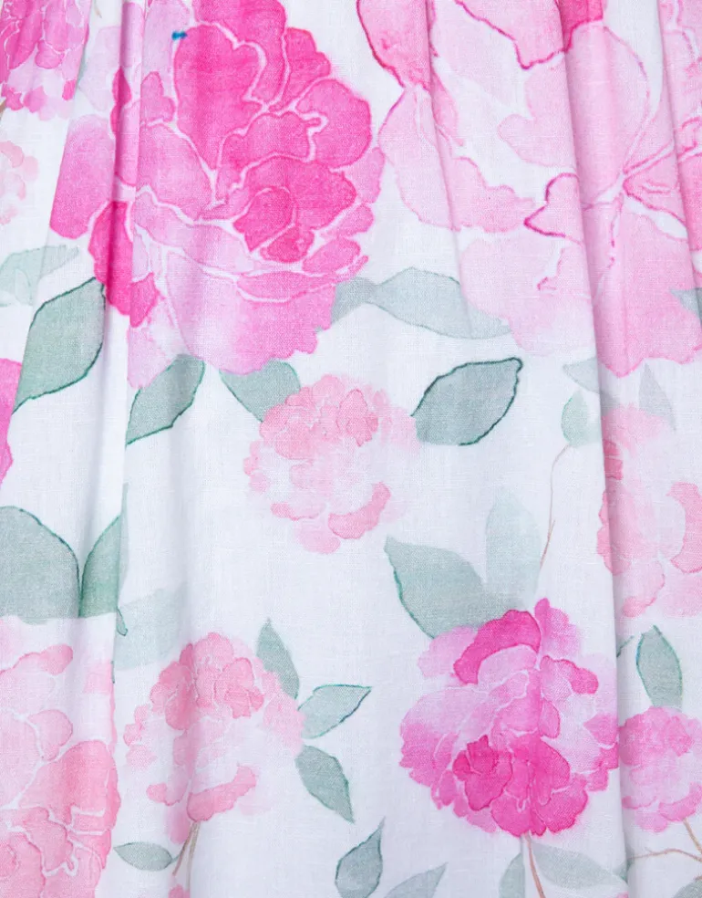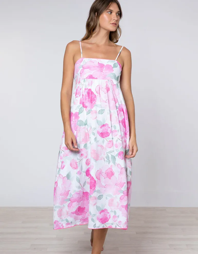 The Peony Tie Back Midi dress from Juliet Dunn is a gorgeous floral print dress with a bandeau bodice finished with a pretty bow at the back, full skirt, piping at the hems and adjustable spaghetti straps for optimum fit.