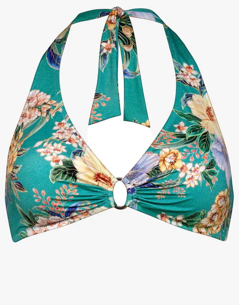 The Pineapple Sea Halter bikini top from Lidea is a gorgeous pineapple floral print on green background. This halter style has moulded cups and ties at the neck.