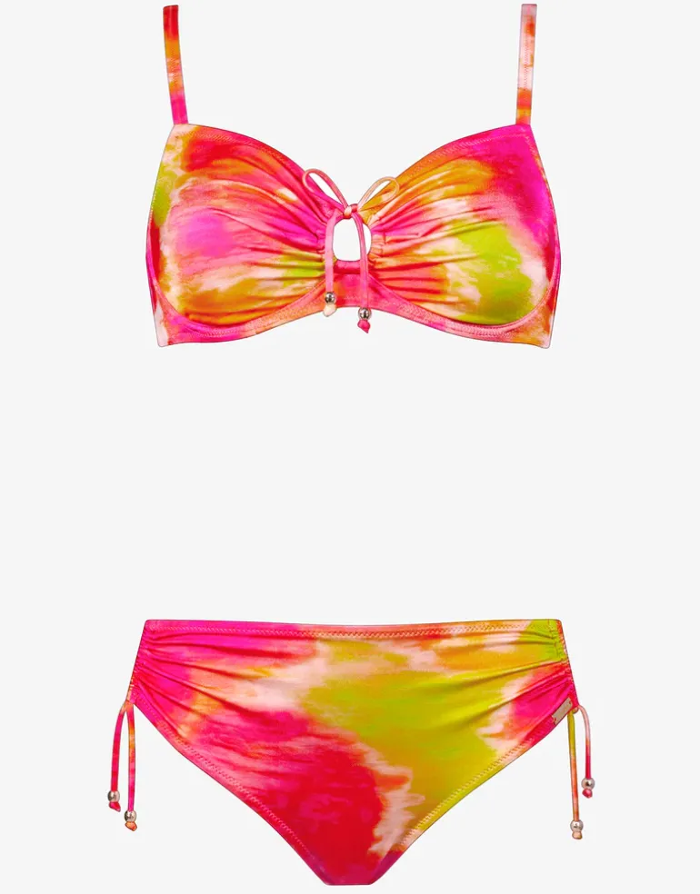 The Pink Aqua Underwired bikini set from Charmline showcases a vibrant pink and green print, ideal for the summer season. The underwired bikini top features adjustable straps, ruching across the cups, and a peephole detail with a tie in the centre, adding stylish flair. The bikini pant offers moderate coverage, and tie sides provide the flexibility to adjust coverage as desired.
