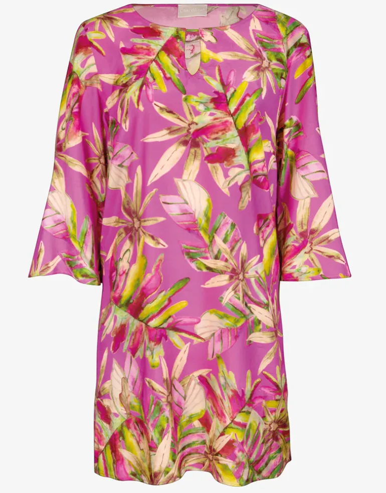 The Pink Heart tunic from Charmline in a beautiful pink and yellow foliage print is a mini length tunic with three-quarter-length sleeves and a keyhole neckline.